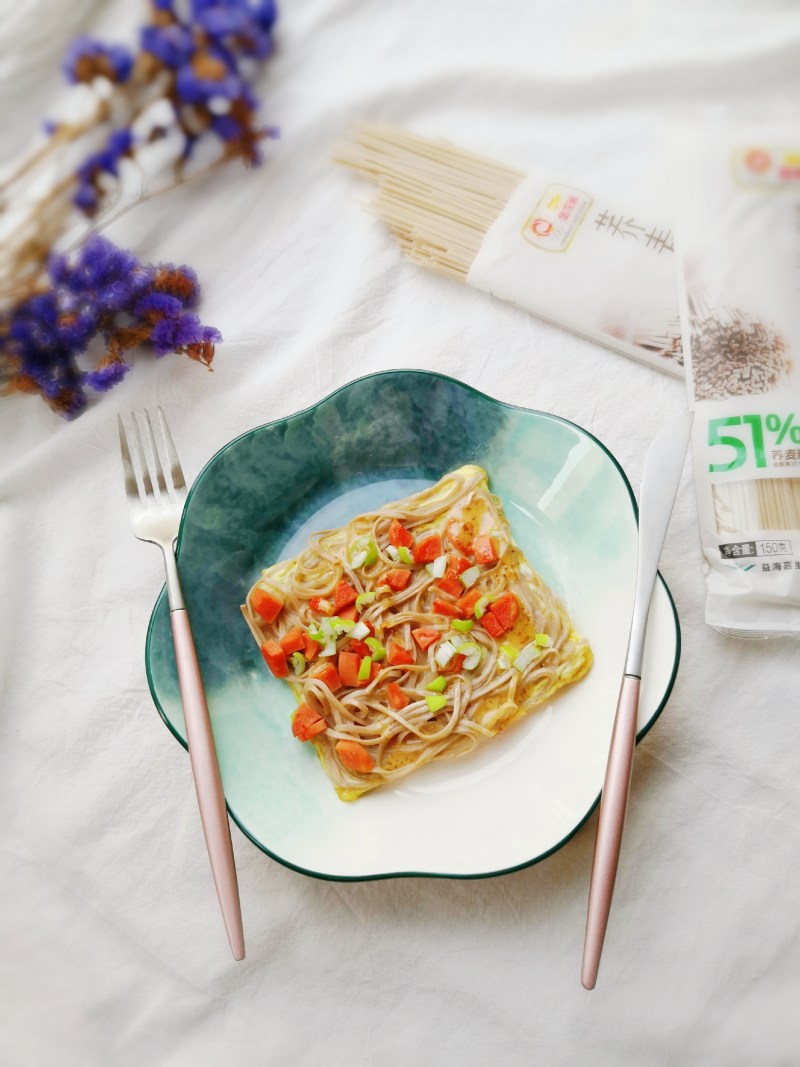 如果煎面技术不是特别好的话,可以先把煮好的面条切碎,这样好煎。其他面条也可以这样做,特别是剩了的过水面条,第二顿就不好吃了,扔了还可惜,就可以这样做!我是为了减脂,所以少油,少盐。