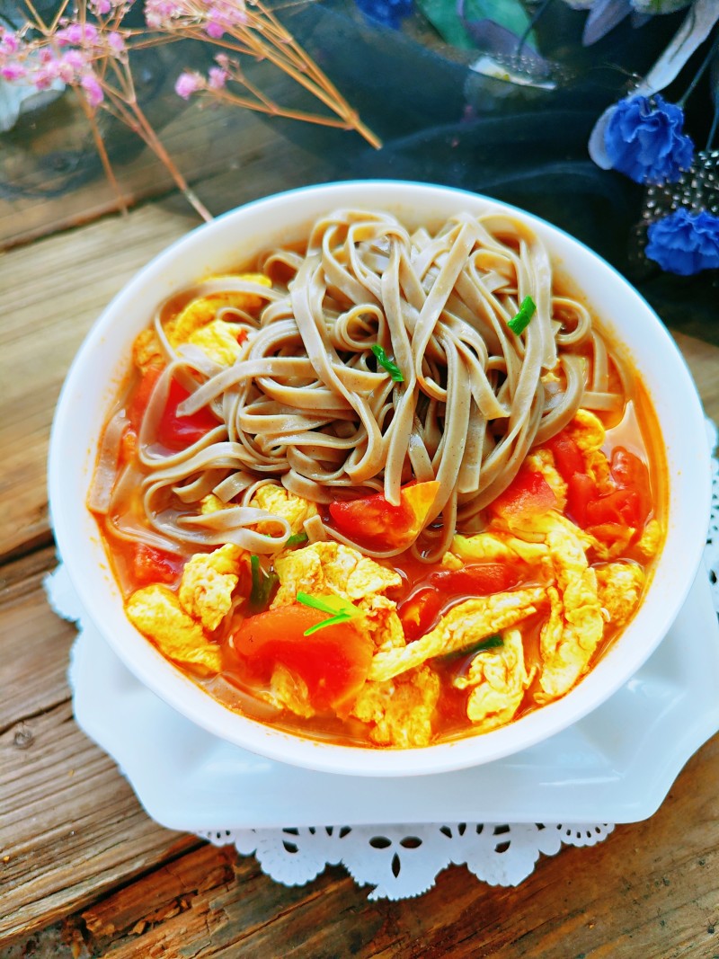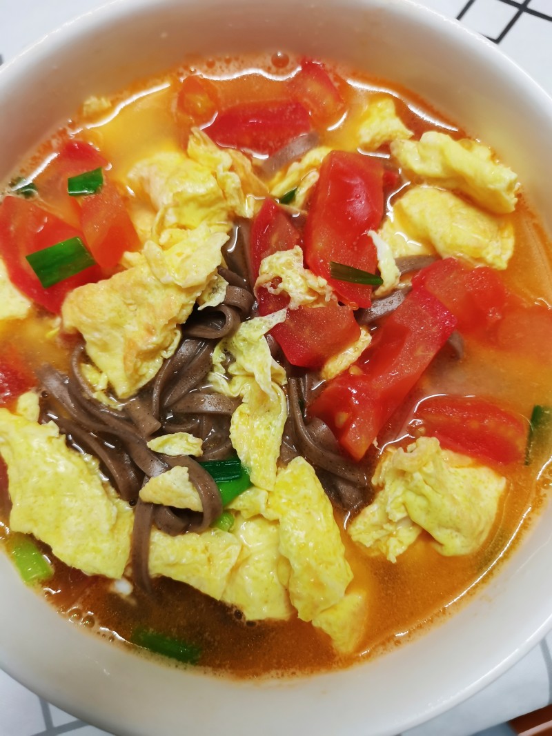 荞麦挂面适量;西红柿一个;鸡蛋2个;大蒜头适量;葱少许;