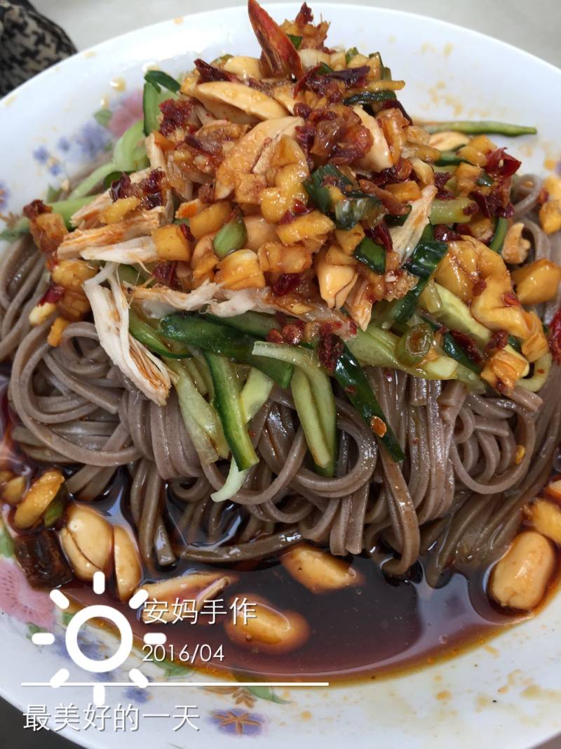 荞麦面若干;鸡肉若干;黄瓜半根;辣味花生少量;