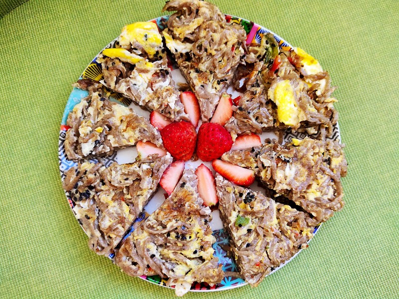 5:先倒入全蛋液,再把沥过水的荞麦面条夹到蛋液里,接着把火腿丁撒上面条上。