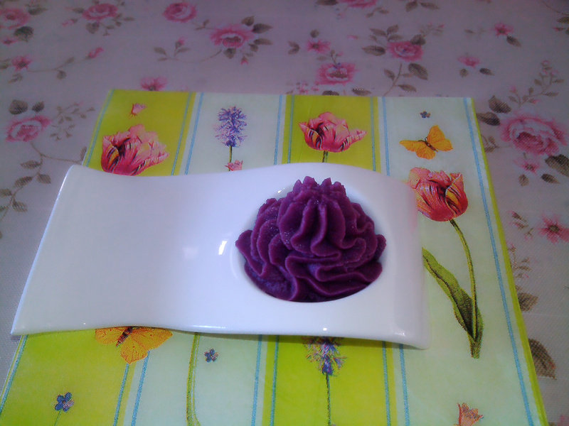 2:将蒸熟的紫薯,在菜板或盆中捻成泥,可根据个人口味加糖或蜂蜜,掌握好稀稠度,装入裱花袋中。