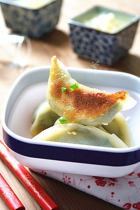 12:直到把水分烧干,饺子底部呈焦黄色,便可撒点葱花和熟白芝麻即可