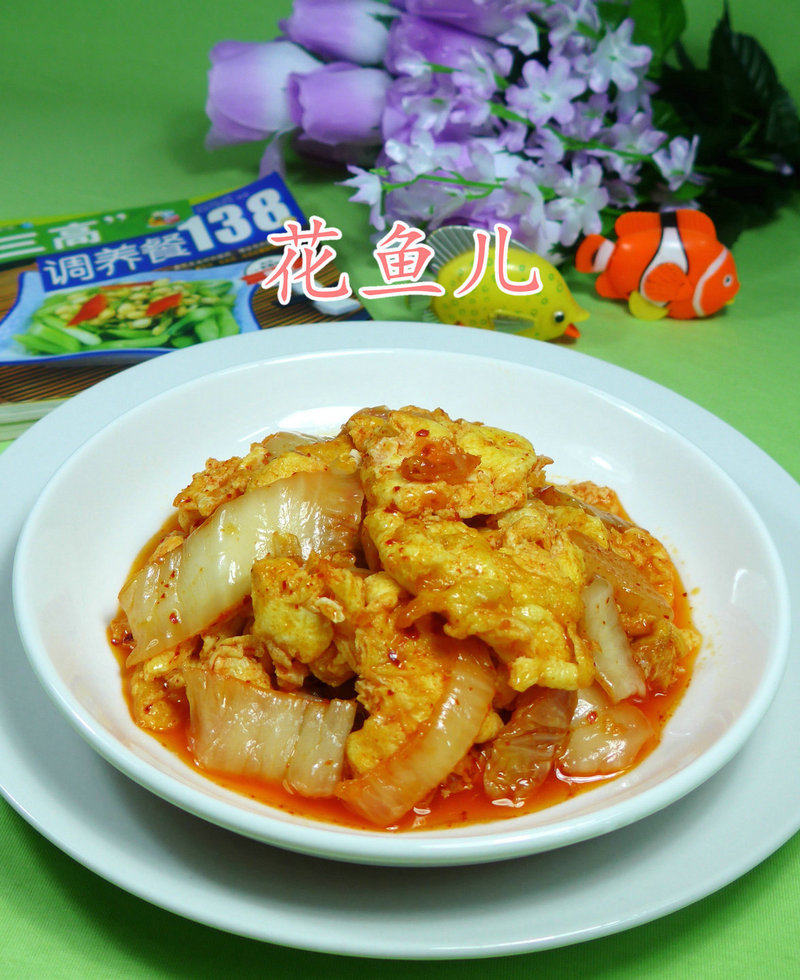 6:煎得蛋液差不多全凝固时放入一半拌好的辣白菜
