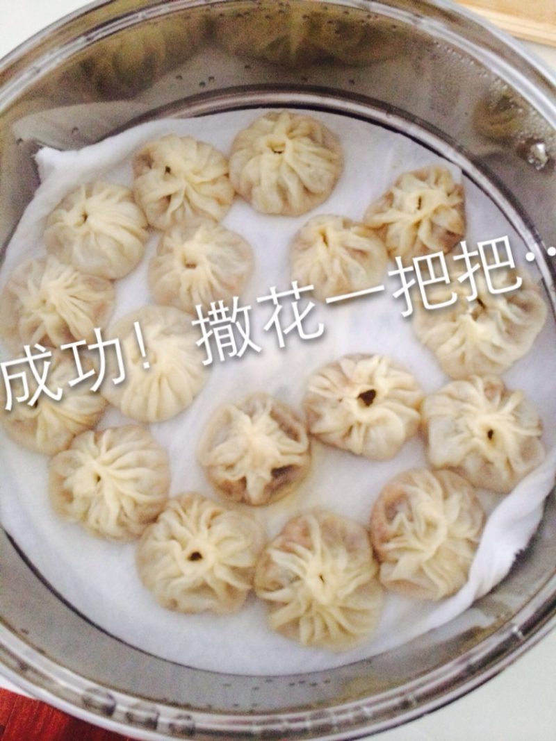 11:开锅后,大火蒸7分钟,关火后焖一分钟。汤汁丰富的灌汤包就好了。好香啊。因为来客人了,忘记拍下来夹开的样子,好遗憾。下次再说吧。
