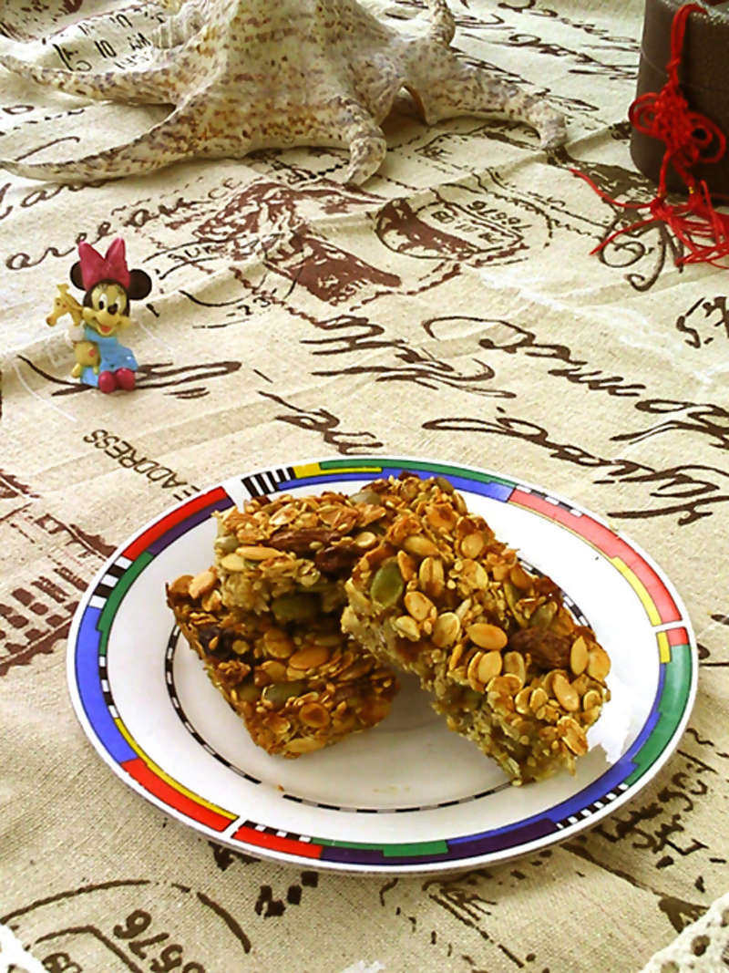 西瓜子仁40克;南瓜子仁35克;葵瓜子仁35克;白芝麻30克;蜂蜜100克;糖渍橘皮丁40克;葡萄干55克;全蛋50克;速食燕麦片100克;