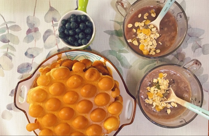 9:约3-5分钟,烤到颜色金黄,没有水气冒出来即可出炉。刚出炉时是稍软的,用风扇吹一分钟即成香脆的鸡蛋仔