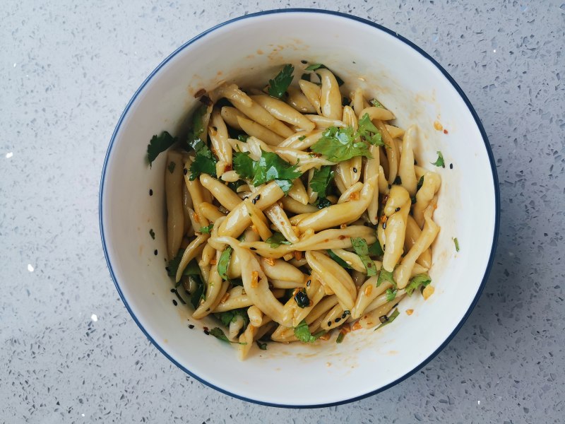 5:水开后,锅里放少许盐,把剪刀面下锅等全部都飘起来了,捞出放到凉白开水里过凉,沥干水分放到碗里,另起锅把蒜末和葱末炒黄倒在剪刀面上,把辅料调成汁也倒进去,放一勺辣椒油,撒上香菜。