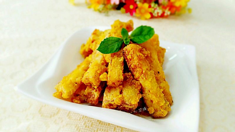 4:炸至表面金黄捞出,再复炸一次捞出备用(一定要炸熟)