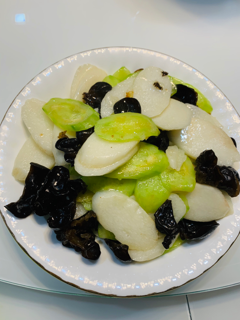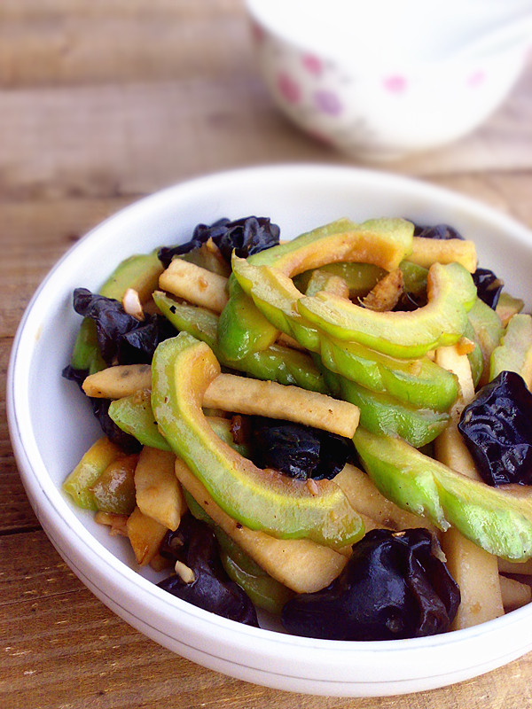 1:备材料,山药、苦瓜形状随意,云耳预先用水煮过
