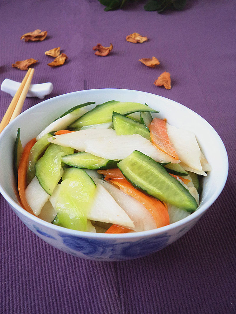 1、此菜清淡,不宜添加多种调味品。2、胡萝卜含有脂溶性营养素要过油后再入菜。3、为保留黄瓜的清香,要关火后将再入锅。