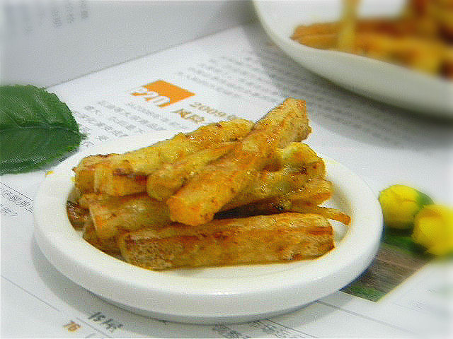 6:下入炸好的山药条,翻炒均匀让每根山药条都裹上蛋黄即可
