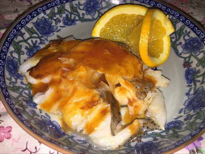 鳕鱼160g;脐橙1个;番茄酱适量;蜂蜜适量;白葡萄酒适量;黑胡椒碎适量;盐适量;橄榄油适量;黄油适量;