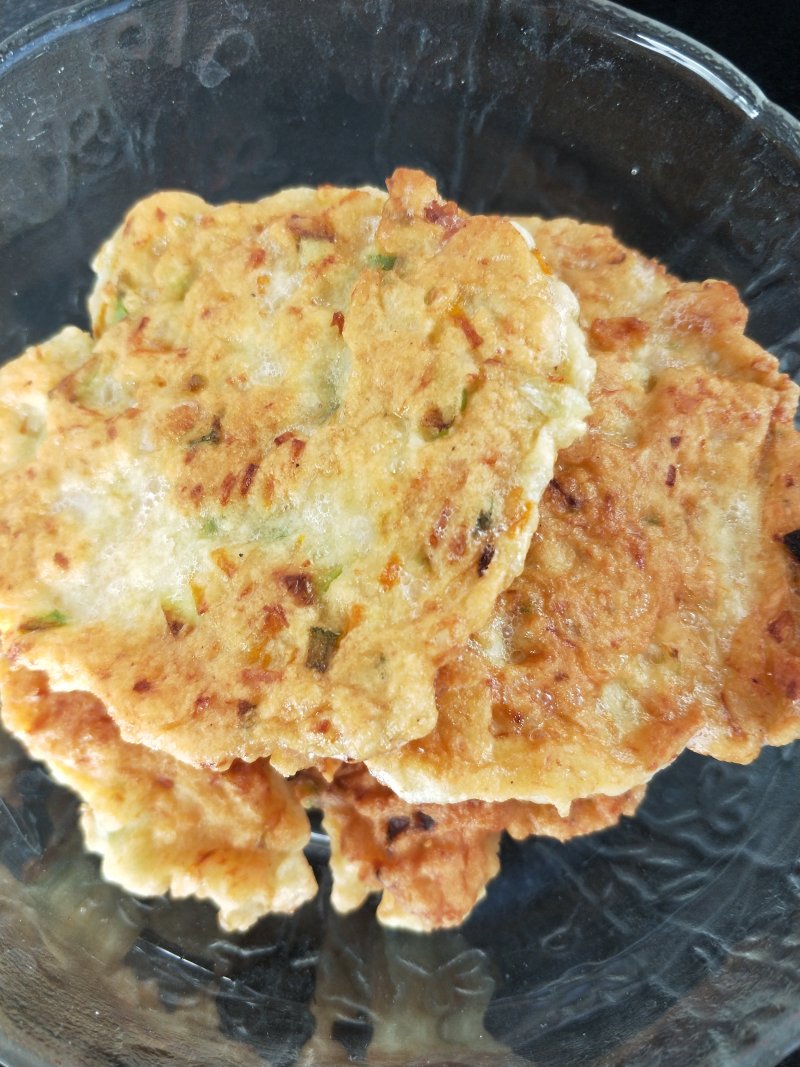 5:平底锅倒入适量油,油温6成热,用勺子舀入面糊,压平,开始小火慢煎,煎至两面金黄出锅。