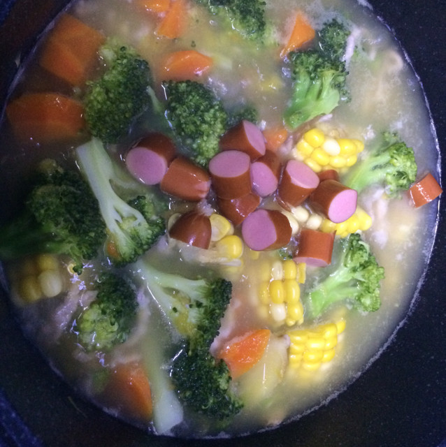 4:所有东西准备好,然后水沸时,把姜片,胡萝卜南瓜玉米全放进去,等待25分钟。