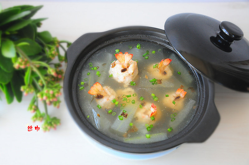 4:加入沒过材料的水,开锅后下浓汤宝,虾。大火滚开后小火熬至冬瓜软烂,下盐就可以出锅啦。