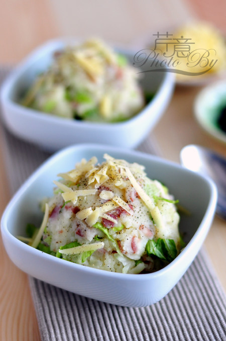 5:混合土豆泥、培根片和洗净撕成小片的生菜叶,加入牛奶、盐、黑胡椒粉拌匀;