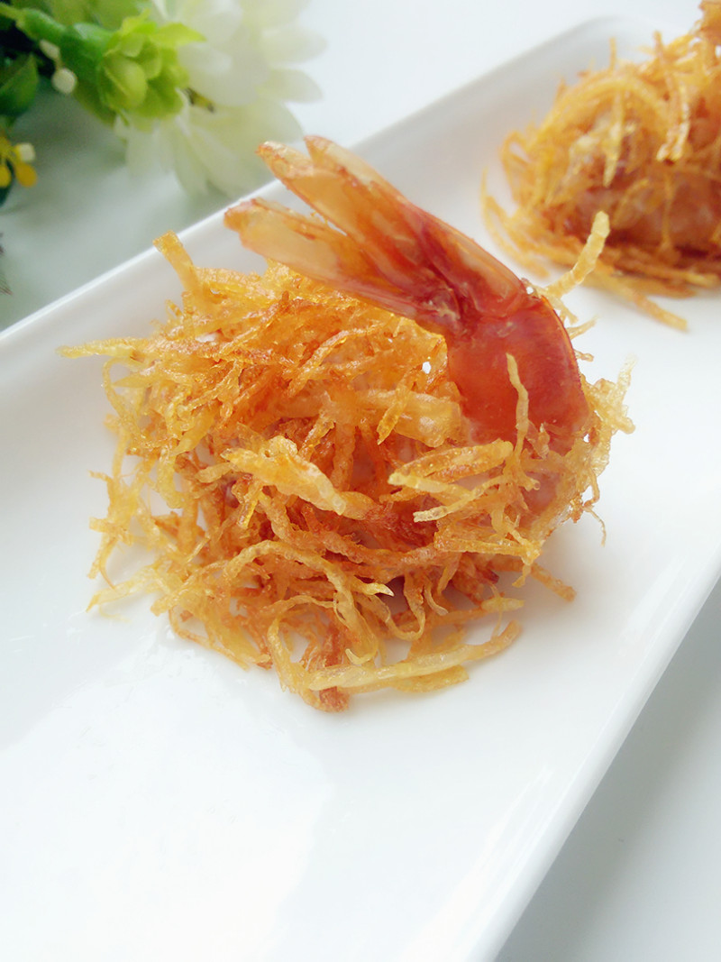 4:炸好的虾裹上沙拉酱放到炸好土豆丝里裹上土豆是就好了