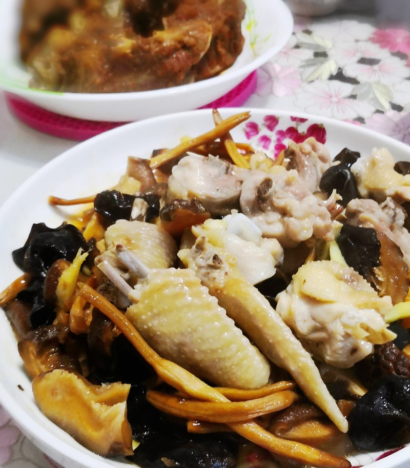1:馋鸡了,买了一个,也吃不完,挑了一个腿一个翅膀蒸着吃。金针,云耳,冬菇是吃货的铁杆粉,记得常吃啊!!!