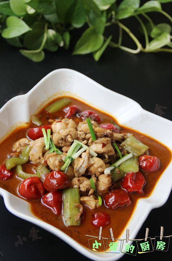 8:加入炒制好的鸡块焖煮,汤快收干时加入切成段的青辣椒,煮至青椒断生即可盛出