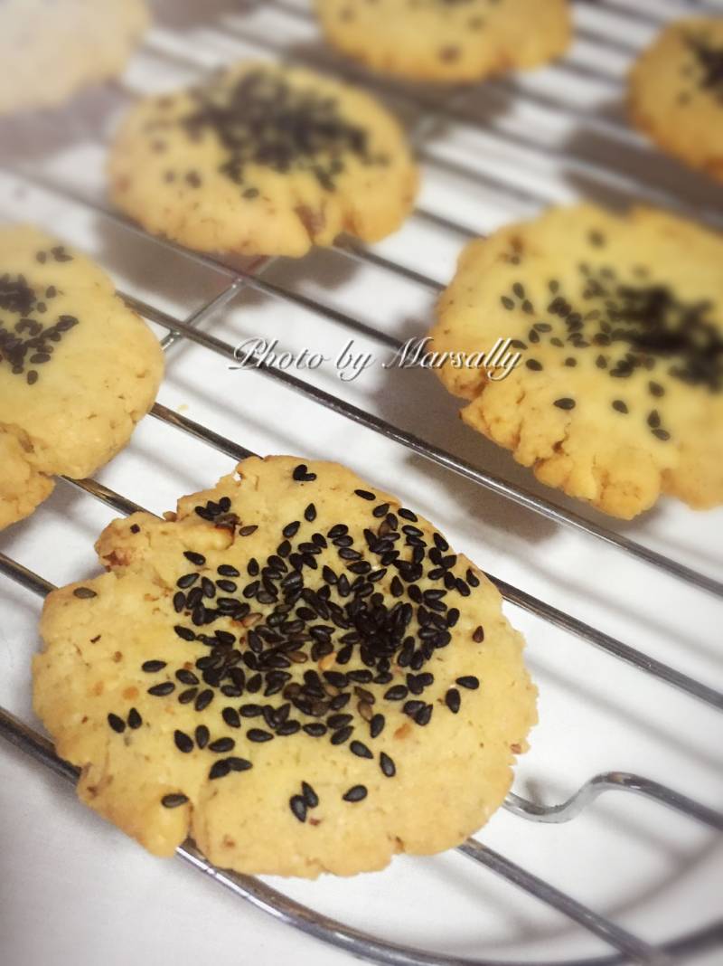 黑芝麻不要提前撒,那样会烤糊。等桃酥快熟了的时候再少烤几分钟就可以了。