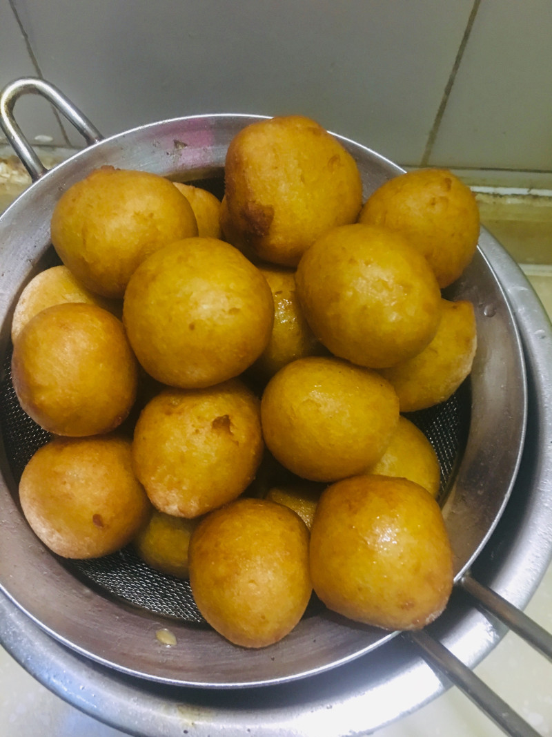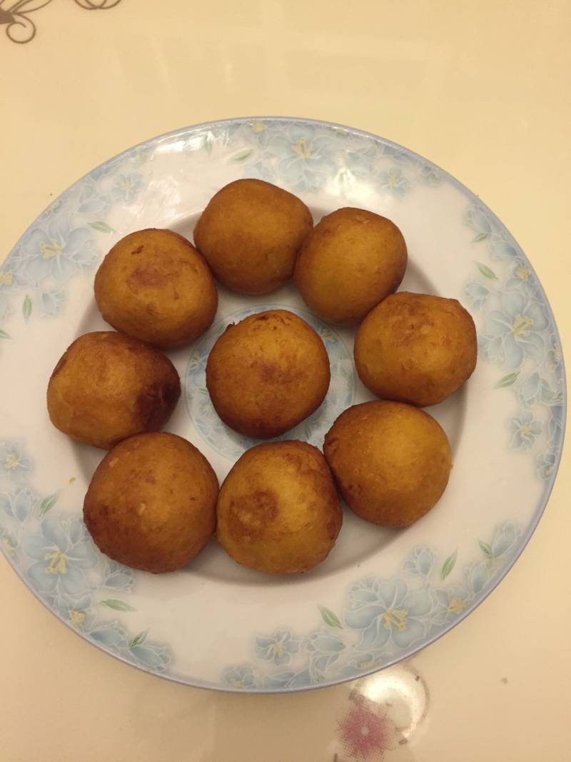 1:蒸好的红薯加面粉搓成圆球下锅。