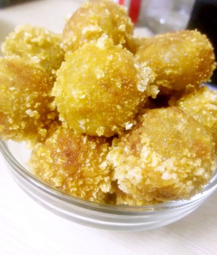 6:丸子裹上一层鸡蛋,在滚一层面包糠。油烧温了放丸子炸成金黄色捞出。(小火煎炸,火大了就糊了)