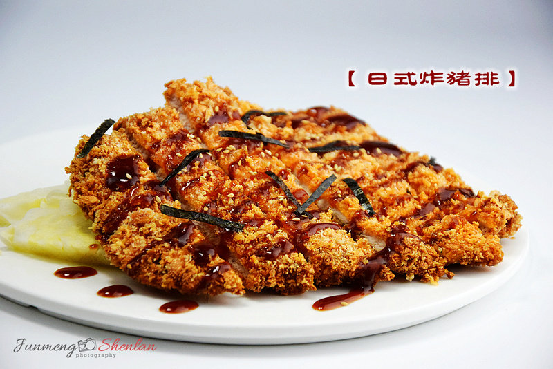 6:油锅中烧油,油温200度时,将猪排入锅炸制,炸制2面金黄色时取出,切成条状,淋上猪排酱汁,再撒上芝麻和海苔丝即可。