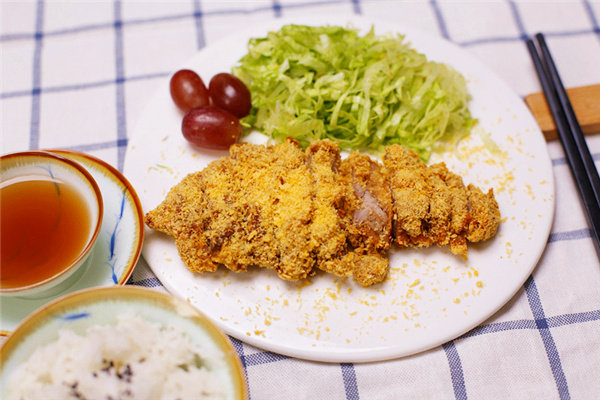 猪肉最好用猪大排,国内比较少见,国外常见于超市中。无需锤打猪肉,保持原始厚度,吃时才有咀嚼口感。面包糠太少会减少外壳的酥脆程度,放置时间为水分充分润湿面粉和面包糠,炸制时减少脱落。火候控制为关键,油温五成即可,保证两面金黄时,一定会外皮酥脆,内里软嫩,炸猪排最佳口感。
