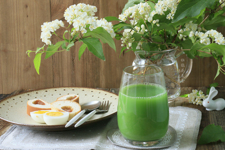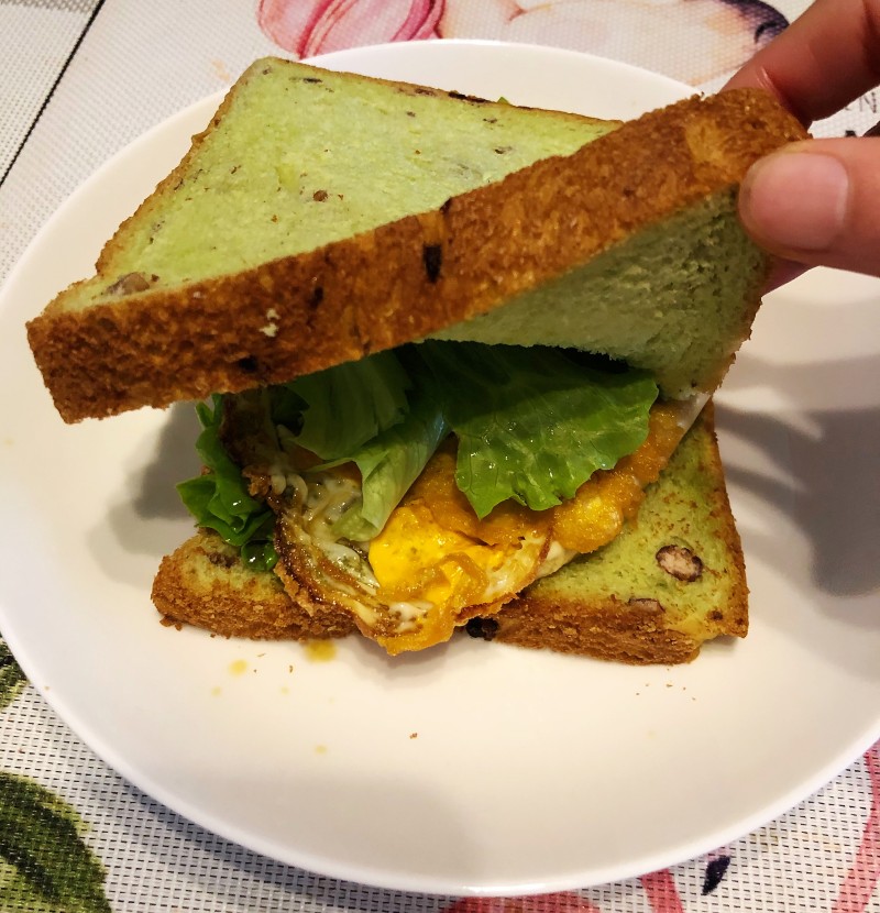 2:抹茶面包上放一片生菜,鸡蛋放在生菜上,再放一片生菜。