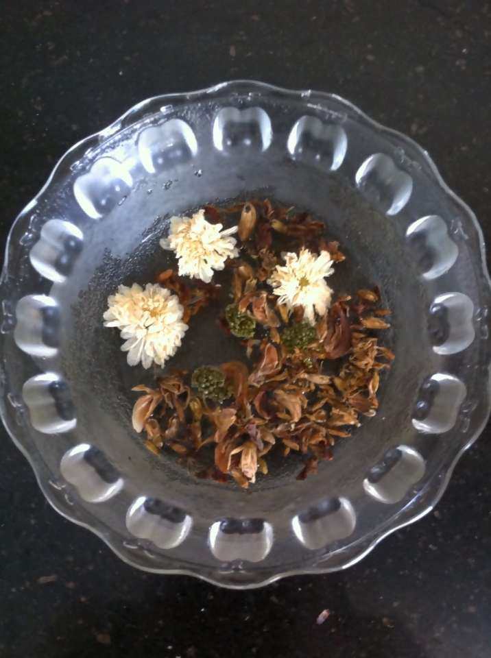 5:准备泡茶的食材,2朵菊花和适量的的枸杞子,再加上焙好的藜麦,此时的藜麦茶直接就可以吃了,很香。