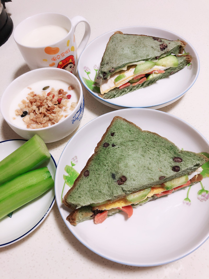 抹茶吐司2片;鸡蛋1个;火腿肠1根;青瓜半根;