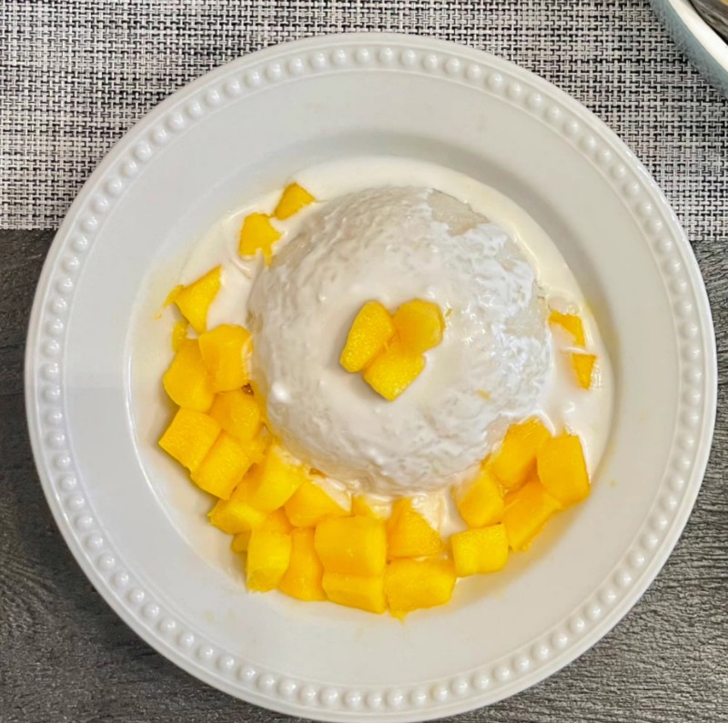 3:浇上加了糖的椰酱,摆上芒果,一口芒果一口饭,试试