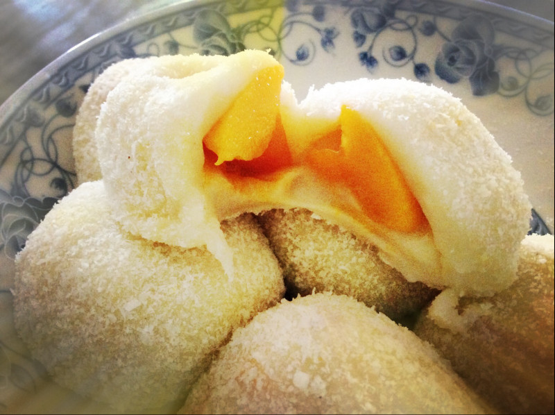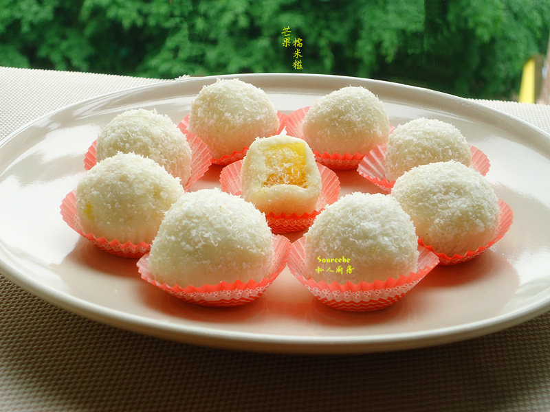 侬侬片语:1、芒果可以换成其他喜欢的水果,比如榴莲、火龙果、猕猴桃……2、刚蒸好的糯米面团,非常粘手,冷却并冷藏一段时间后才会好包馅,如果还是粘手,可以手上抹点油,或者带上一次性手套来包。