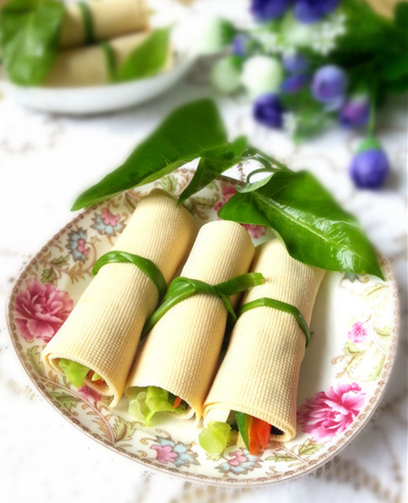 1:主辅料:豆皮、黄瓜、生菜、小葱调味料:黄豆酱