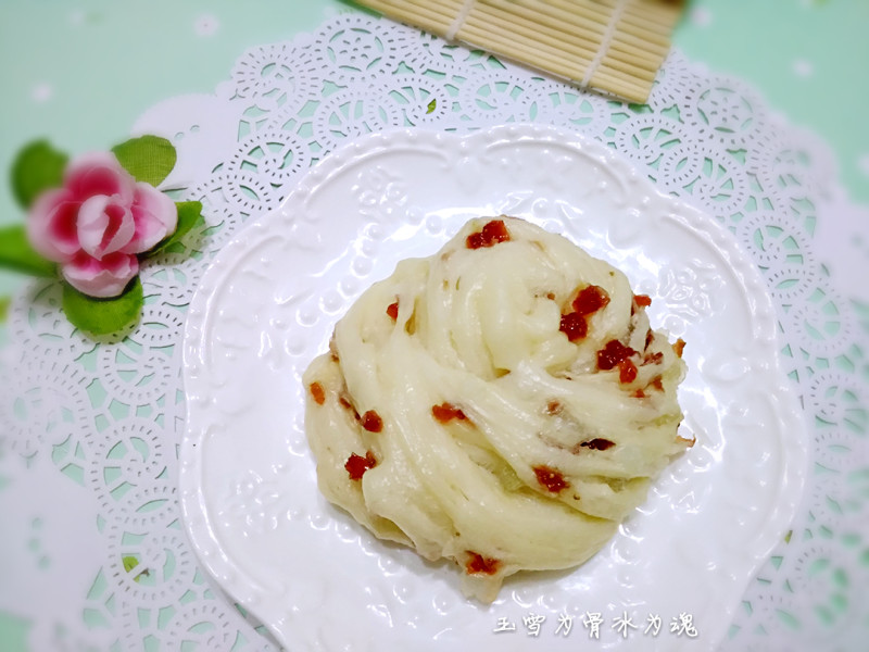 1:酵母加少量温水化开,倒入面粉里,再加入水,白糖,揉成柔软的面团。放在温暖处发酵至两倍大。