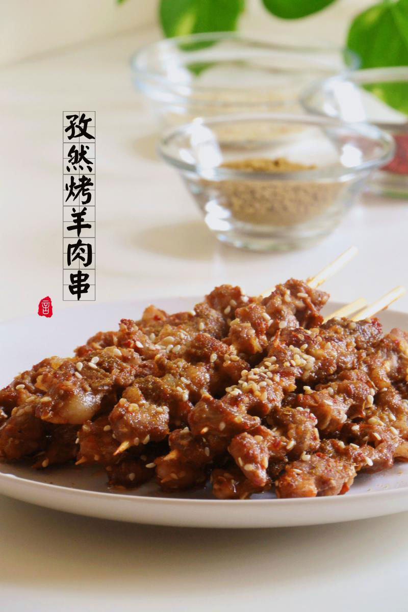 6:将羊肉串成串。刷上油,撒上剩下的孜然粉和白芝麻,放入烤箱烤7分钟左右。