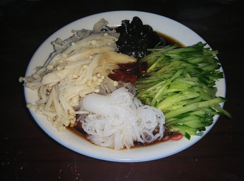 金针菇200g;木耳15个;黄瓜1根;魔芋240g;干辣椒2个;