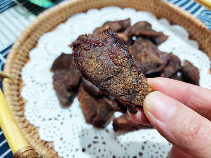 12:要吃的时候,取出一些牛肉干,表面抹点油,直接放空气炸锅180度,10分钟即可。或者锅子里用少许油煎一煎就行了。