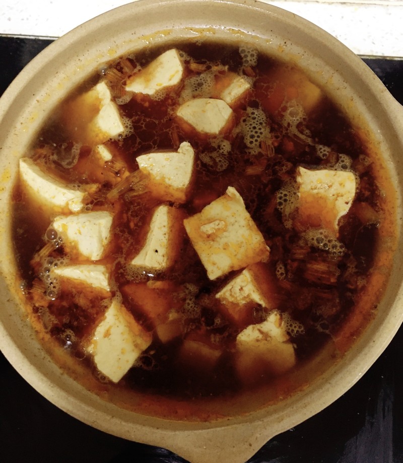 5:炒好的料放入砂锅中,加入清水,把豆腐放进去,加十三香,盐,鸡精,少许老抽
