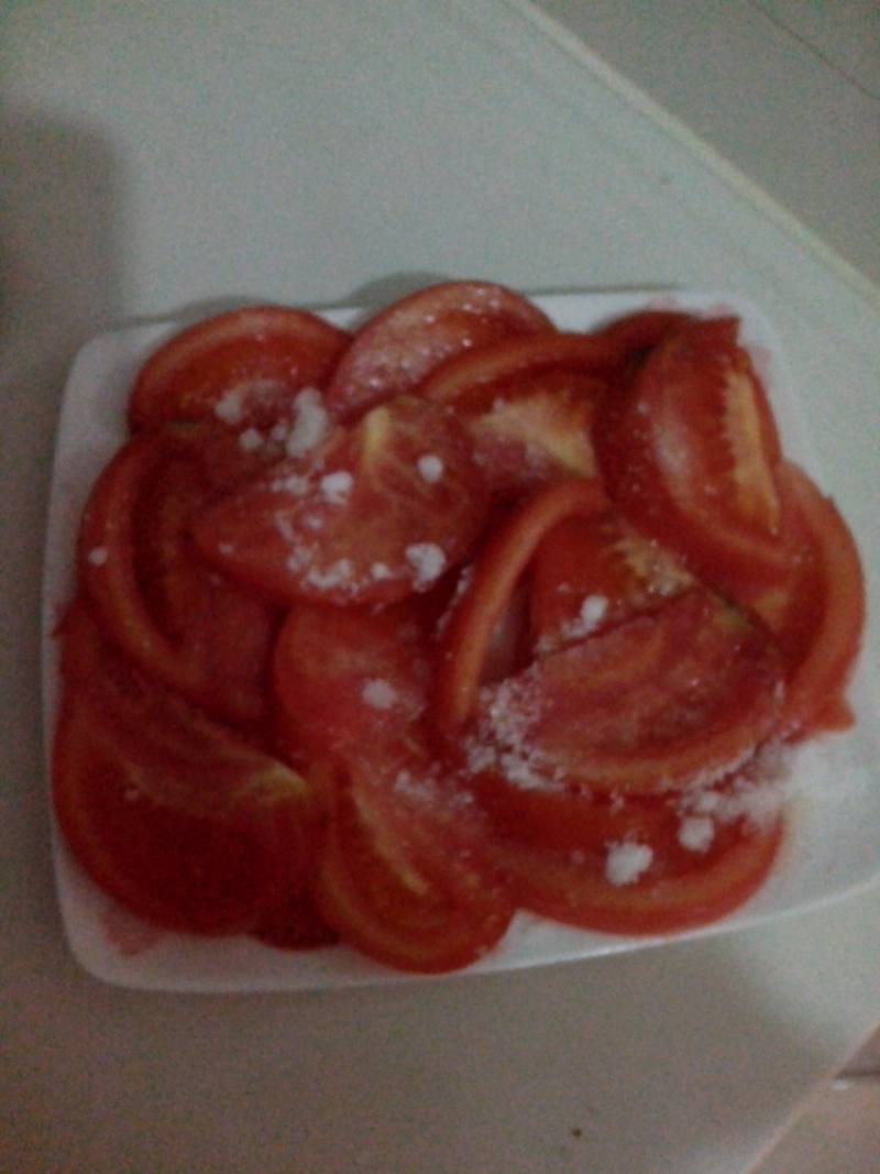3:西红柿放在盆里上面撒些白糖,拌匀。
