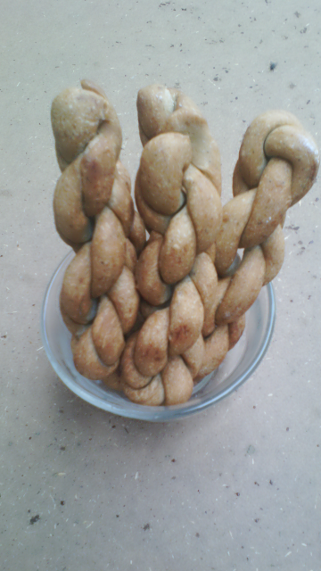 5:左手从面条中间提起,右手拿住一根面条顺时针往另一根面条上缠绕