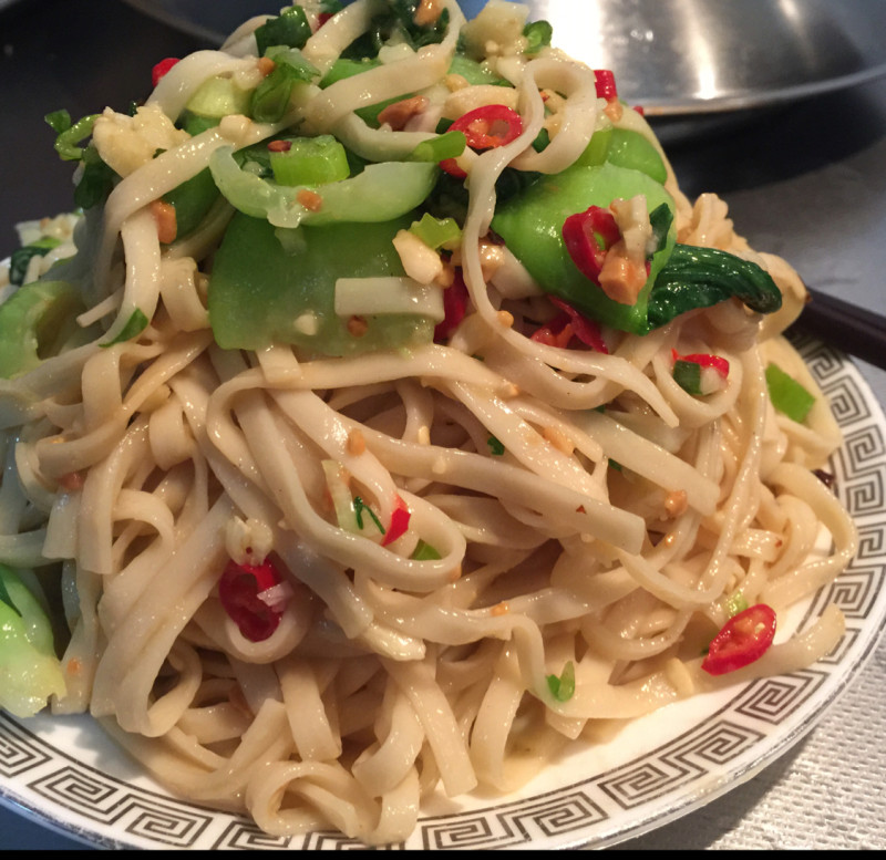 6:煮面的过程没有拍,煮好的挂面一定要过凉水。过了水的面丢凉拌盆里,然后把蒜沫,香葱,小米椒,油菜等,也丢凉拌盆里。