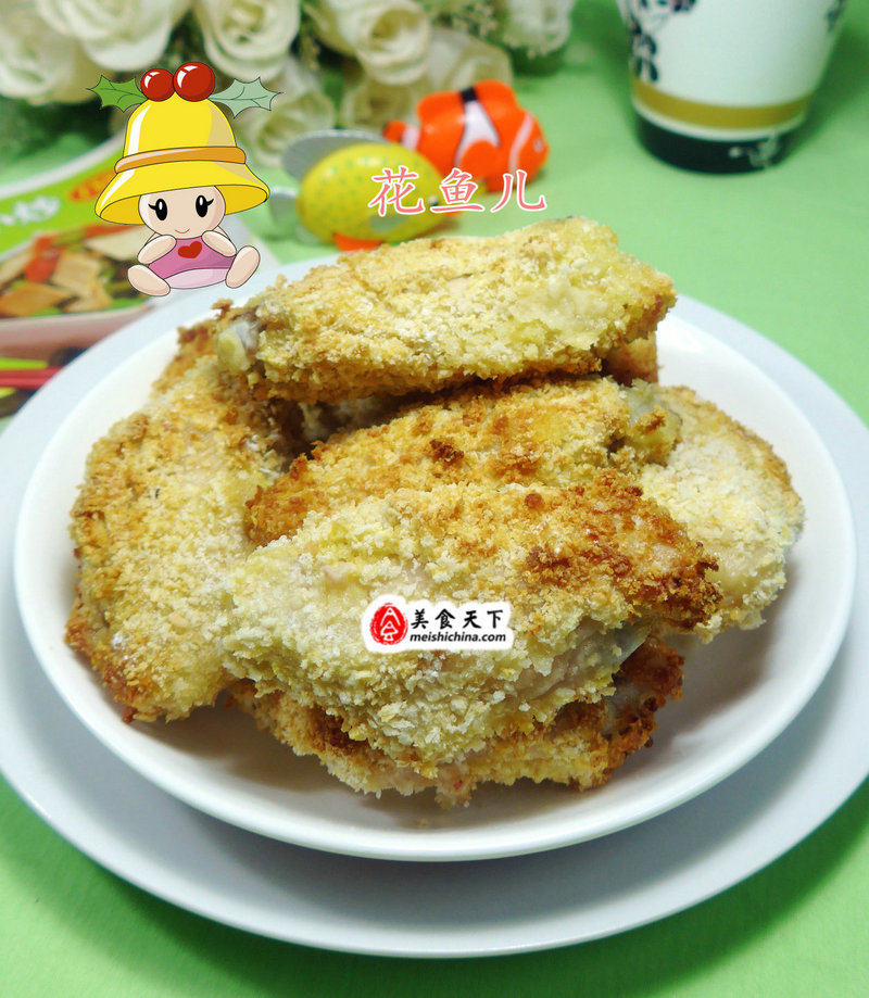 3:腌渍好的鸡翅先沾生粉,再在蛋液滚-下,然后沾满面包糠.