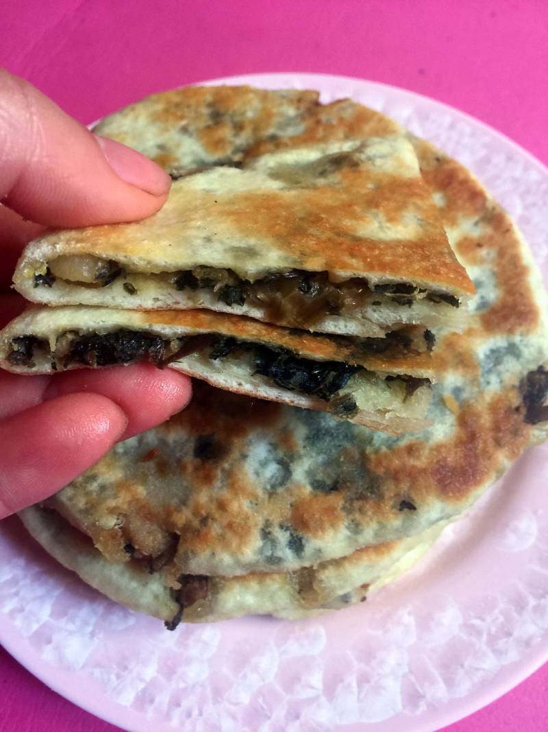 1:把两块面皮的中间均匀加入梅干菜,放入油锅中煎制。
