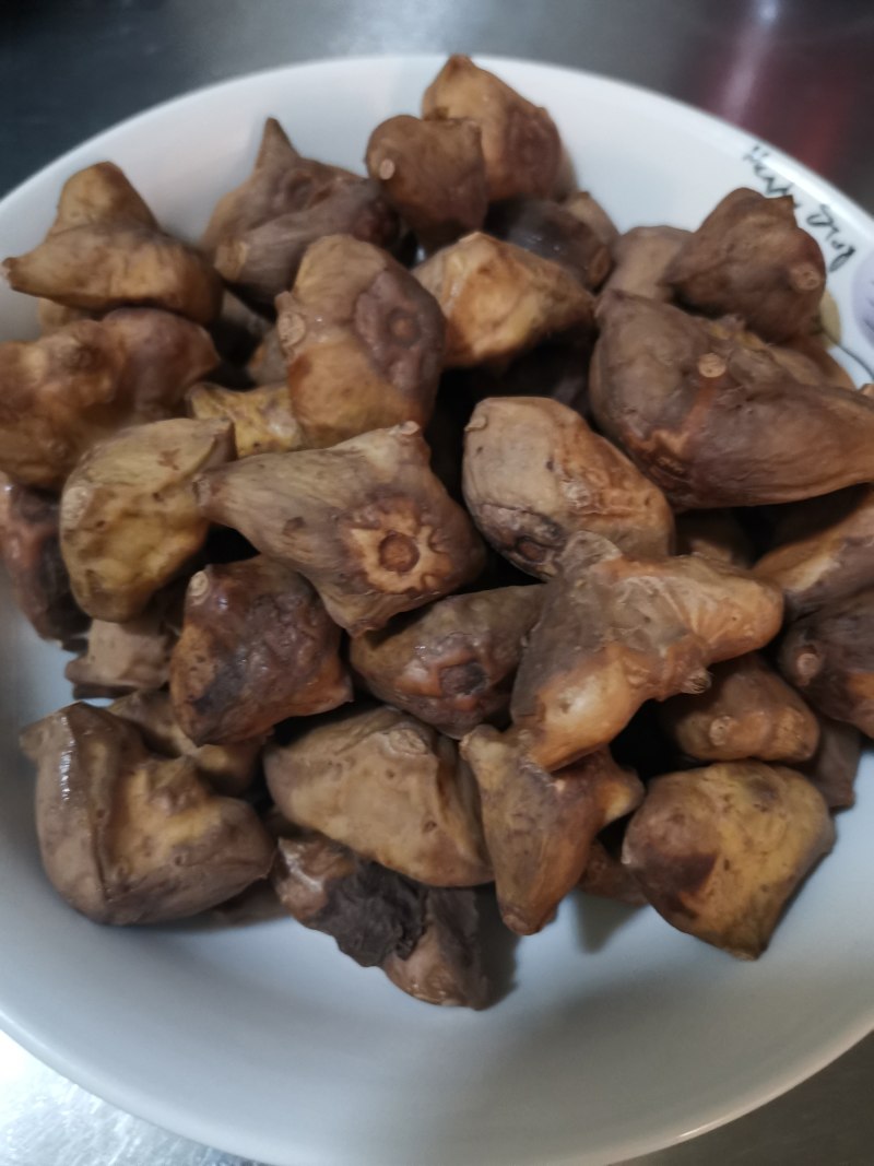 3:倒入菱角,水不要太多,不需要漠过菱角,中火慢慢煮。