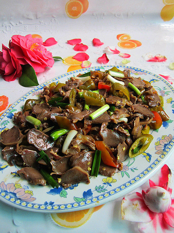 7:翻炒片刻,将酸辣味融入鸭胗里。