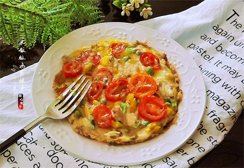 8:如果没有烤箱可以在米饭里磕入一个鸡蛋打散后,不粘锅放油小火微煎成型后撒上所有材料盖上锅盖焖至奶酪丝变软即可!