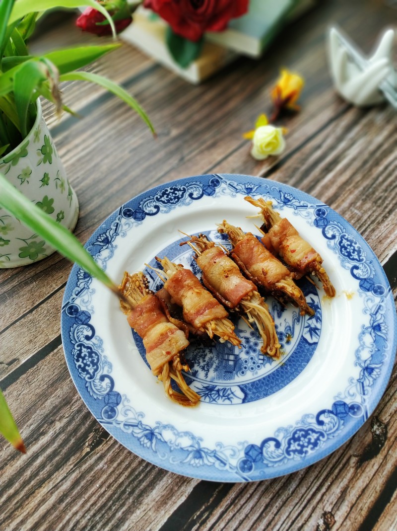 2:用培根将金针菇卷起来。用牙签固定。这里卷多少金针菇,看你准备的培根和金针菇的量来分配吧。卷多也不怕,金针菇比较好熟。