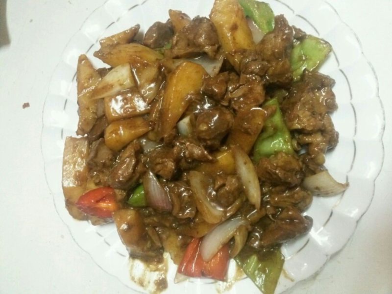 16:米饭倒扣在盘中,鸡排切块码入盘中,倒入咖喱土豆。怎么样,不错吧?