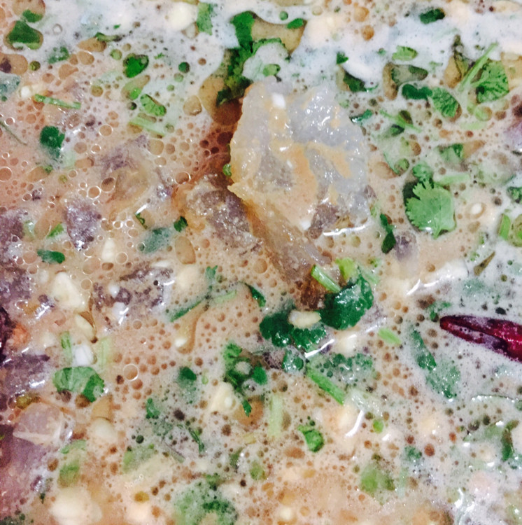 5:加入浓汤宝(我用的是家乐浓汤宝),放点老干妈。汤开了,就把米粉倒进去。米粉不能太早加,因为之前已经煮软了。